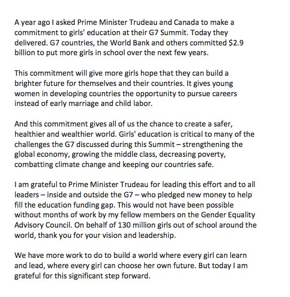Ο οικοδεσπότης της συνόδου, ο καναδός πρωθυπουργόςΤζάστιν Τριντό, δήλωσε πως πρόκειται για «τη σημαντικότερη επένδυση στην εκπαίδευση των γυναικών και των κοριτσιών σε καταστάσεις κρίσης και σύγκρουσης».