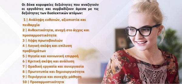 Υπολογίζεται ότι μέχρι το 2025 οι άνθρωποι και οι μηχανές θα μοιράζουν την εργασία 50-50 και θα χρειαστούν άνθρωποι για να εκτελέσουν όλες τις προσωπικές δεξιότητες που δεν μπορούν να κάνουν οι μηχανές. Οι δεξιότητες που θα χρειάζονται όλο και περισσότερο στον σημερινό ψηφιοποιημένο και αυτοματοποιημένο κόσμο είναι οι δεξιότητες στις οποίες διαπρέπουν οι δυσλεκτικοί, όπως: