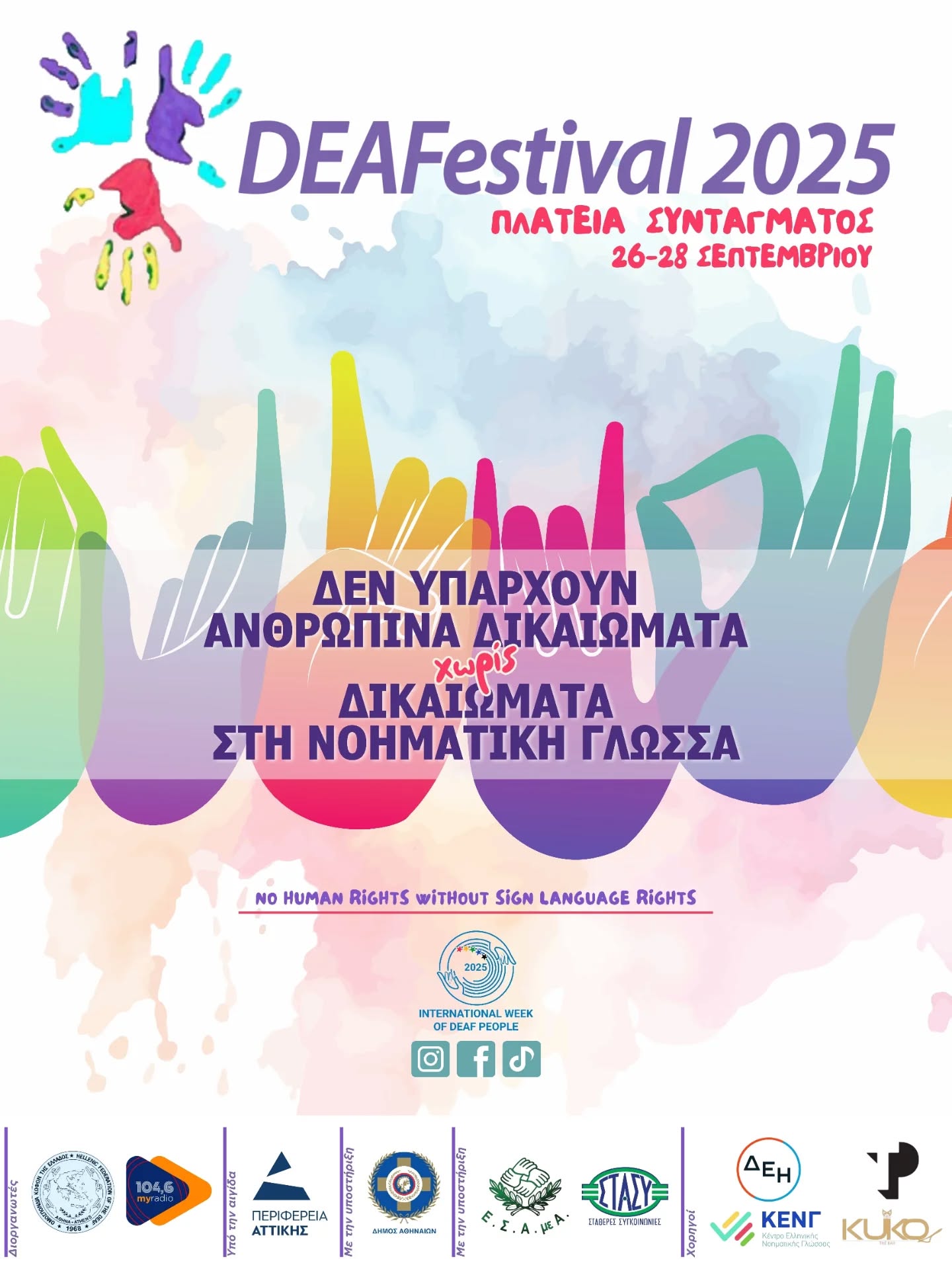 Η Ομοσπονδία Κωφών Ελλάδος (ΟΜΚΕ) και ο 104,6 My Radio ανακοινώνουν με ιδιαίτερη τιμή τη διοργάνωση του DEAFestival 2025, το οποίο θα πραγματοποιηθεί από την Παρασκευή 26 έως και την Κυριακή 28 Σεπτεμβρίου, για δεύτερη συνεχή χρονιά στην Πλατεία Συντάγματος, στο κέντρο της Αθήνας.